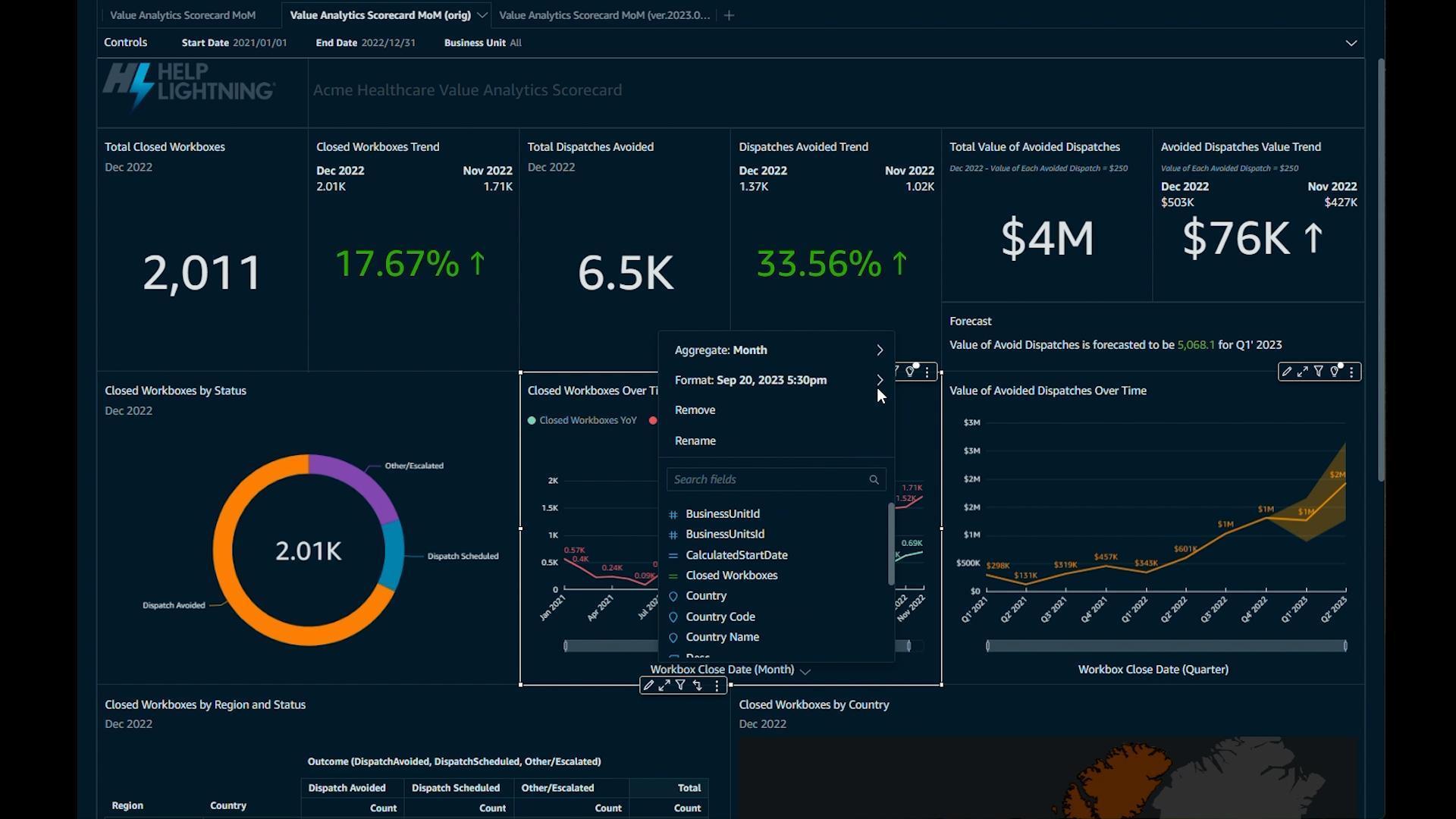 AI support for trend predictions and what-if analysis is included. You can drill down through interactive visual scorecards and metric measurements by region, division, product-line, equipment model, customer, incident type even user groupings and skills to understand what is working well and where you need to improve.