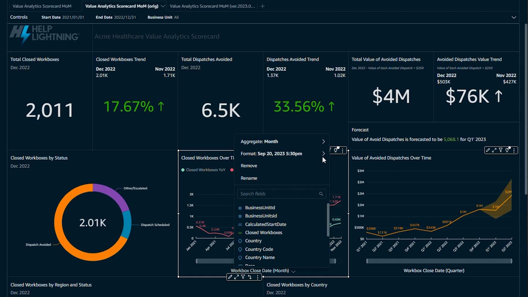 AI support for trend predictions and what-if analysis is included. You can drill down through interactive visual scorecards and metric measurements by region, division, product-line, equipment model, customer, incident type even user groupings and skills to understand what is working well and where you need to improve.
